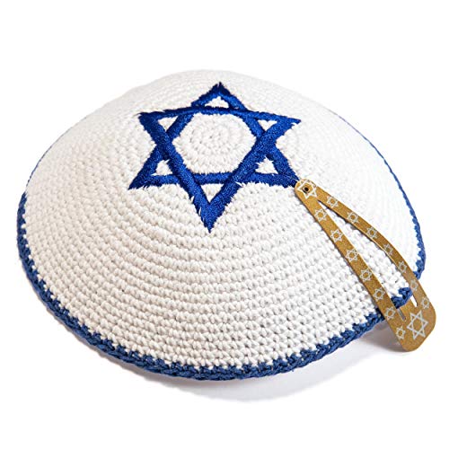 A 16 cm decorated white knitted kipa with navy blue Star of David Israel flag design, 100% Jewish and kosher for everyday use or Jewish holidays and Yom Tov. Wear It With Pride. Product Features Quality Kippah For Synagogue Or Jewish Events And Festivals. 100% Jewish and Kosher. Wear It With Pride.