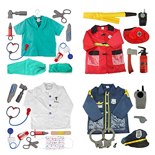 Products include: Doctor costume set, Surgeon costume set, Fire Chief Costume Set, Police Officer Costume set. Material: polyester, nylon and plastic Product includes:*Doctor costume set: lab coat, face mask, stethoscope, thermometer, reflex hammer, blood pressure utensil, safe scissors, safe syringe, adhesive bandage *Surgeon costume set: surgical top, surgical pants, matching hat, stethoscope, thermometer, reflex...