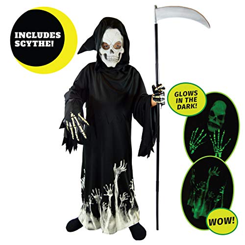 Spooktacular Creations Grim Reaper Glow in the Dark Effect Child Deluxe Costume Set. Includes Grim Reaper Hood with Attached Cape, Robe, Skeleton Mask, Vinyl Skeleton Gloves and Scythe!!! GLOWing Effect on Vinyl Skeleton Gloves and Robe. Super Value Pack for Role Play. Perfect for Halloween Dress Up Parties, Grim Reaper Themed Parties, Grim Reaper...