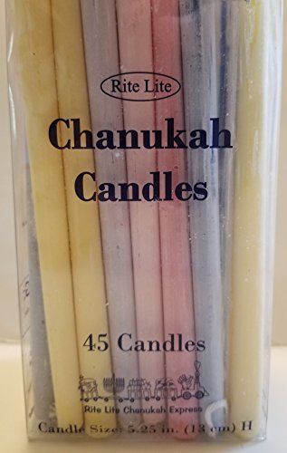 Rite-Lite Premium Chanukah Candles Grayish Yellow PInk Purple Mult- Tall Measures 5.25 inches Box of 45 Product Features 45 Premium Hanukkah candles Rite Lite founded in 1949 by Holocaust surviror Jacob Rosenthal for 50 years. Enough for 8 nights of Hanukkah Size to fit most menorah. 100% Lead Free Rite-Lite Premium Chanukah Candles Grayish...