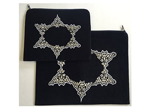 Alef Judaica Black Velvet Zipper Tallit Bag and Tefillin Bag Set with Large Silver Star Of David Made Of Leaves Design. Tefillin Bag Dimensions: 9.5 X 7.75 Inches. Product Features Alef Judaica Beautiful Design! Top Quality! Conversation Starter!