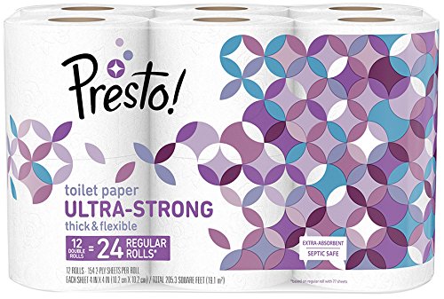 Presto! Ultra-Strong Toilet Paper offers great strength with the comfort you expect. This septic-safe bath tissue is up to 80% stronger than the leading 1,000 sheet brand. Each mega roll lasts 4X longer than a regular roll of toilet paper (based on a regular roll with 77 sheets) . Presto! Ultra-Strong Toilet Paper is...