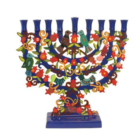 This wonderfully crafted menorah by Yair Emanuel features a traditional candelabrum shape with a truly bright and contemporary design. The entire face has been wonderfully accented with a tree design colored in orange with green leaves, red pomegranates, and pink and blue birds. Beautiful symbolic accents of pomegranates add a wonderful feeling of prosperity...