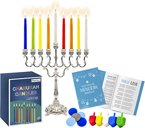 Complete Chanukah Menorah Set – Silver-Plated Classic Menorah, 45 Multicolored Candles, 5 Plastic Multicolored Dreidels & Hanukkah Play Coins, Hanukkah Booklet, Hanukkah Instruction Game Card Product Features Classic Silver Plated Elegant Design Candle Menorah, Measures 7″ Tall. Multicolored Hanukkah Candles: Green, Red, Orange, Blue, White Multicolored Hanukkah Dreidels: Variety Of Medium Plastic Dreidels –...