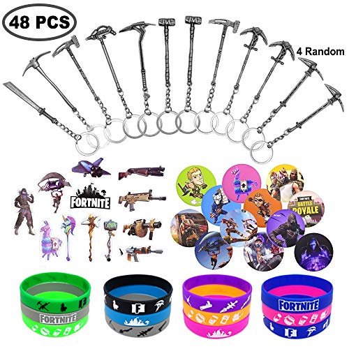 🎁48Pcs Video Game Party Favors 🎮Package Includes: 12 x Pickaxe Key Chains with different design (8Pcs different designs and 4Pcs random) 12 x Silicone Bracelets with different color 12 x Badge Pins with different design 12 x Cartoon Tickers with different pattern 🎈Notes: 1. Recommended for children 3 years of age and older. 2....