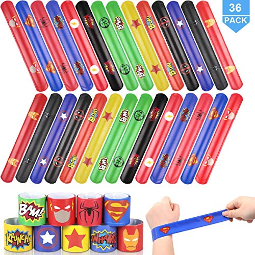 Product Features 18 Different Superhero Designs: Package includes 36 pack superhero slap bracelets, every design has 2 pack, all kids could choose their favorite heroes. The colors are bright and fun and won’t fade. Fit Anyone: Each bracelet measures 8.6 inches. Made from soft, flocked material on the inside, shiny plastic on the outside...