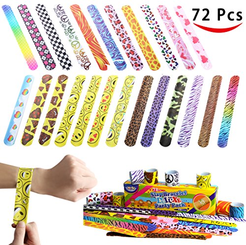 A Classic Party Favor Gift for Anyone! 24 Print Designs include Emojis, Animal Skins, Colorful Hearts, Peace Symbols, Valentine’s Day images and more. Includes a great variety of colors & designs. Comes in a pack of 72 assorted plastic vinyl bracelets. Easily circles your wrist with a slap. Product Features 24 Print Designs include...