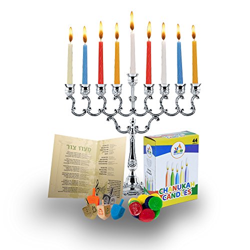 Stop the hunt here, this set has it all. Quality, Value, Price! Product Features MENORAH: Ner Mitzvah Silver Plated elegant design Candle Menorah, measures 7″ tall. CANDLES: Box of 44 colored Hanukkah Candles, enough for the whole 8 days of Chanukah. DREIDELS: Variety of medium plastic Draydel – wooden – gold – metallic –...