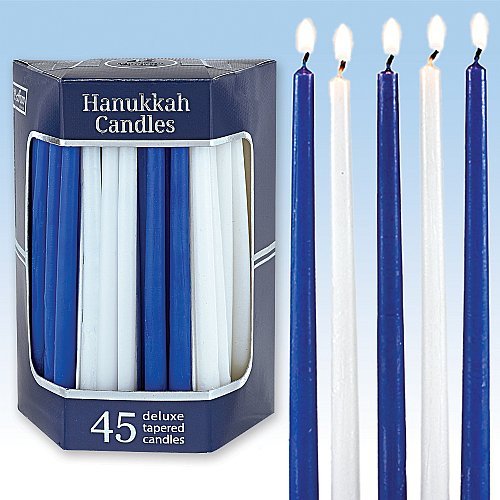 Deluxe Tapered Blue and White Hanukkah Menorah Candles For All 8 Nights of Chanukah Product Features Deluxe Tapered Blue & White Hanukkah Menorah Candles For All 8 Nights of Chanukah 45 Candles Per Box Happy Hanukkah!!
