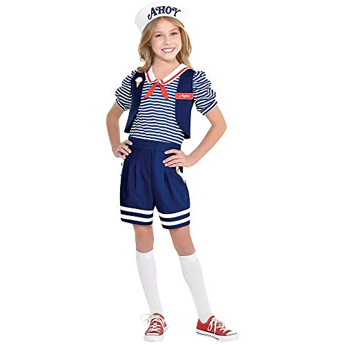 Your little one can help uncover the dark secrets of Hawkins, Indiana dressed in a Stranger Things Robin Scoops Ahoy Costume for kids! The blue and white sailor suit romper is modeled after Robin’s Scoops Ahoy uniform, with a blue and white striped top, an attached vest, and blue, sailor-style shorts. Finish the outfit...