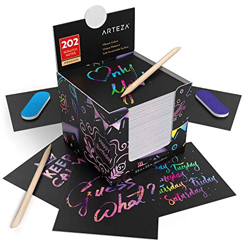 Product Description Scratch Notes Rainbow sets are the perfect, cute and unique gift ideas for kids, women, and teens. Each set comes with 200 Rainbow patterned notes and 2 Space patterned notes perfect for arts, crafts, and games for children and adults. The beautiful rainbow colors are hidden beneath the black matte coating of...