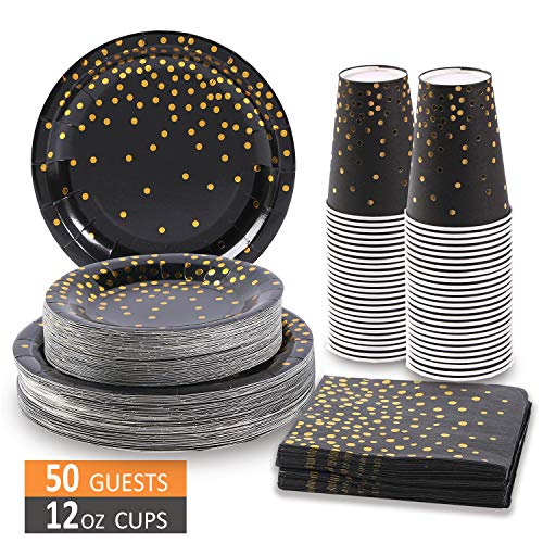 Are you still looking for black and golden themed party supplies dinnerware? One-step shopping gets all party dinnerware you needed from Duocute Direct. Black golden foil dot disposable paper plates and cups add an elegant, modern touch to any party. Material’s safety is our priority. 100% food-grade paper material is eco-friendly and BPA-free knives...