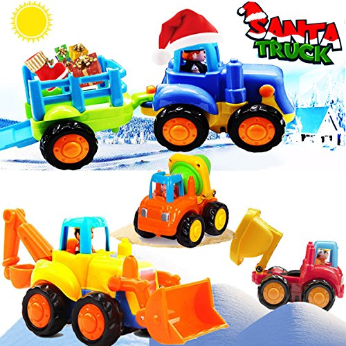 Push and go set of 4 Friction Powered Toy Trucks for Toddlers.Perfect for enthusiastic little hands. Made of high quality, sturdy plastic. Long lasting friction power.Best Early Educational Toys. Includes:1 cement truck,1 dump truck,1 bulldozer and 1 farm tractor with wagon. Bulldozer: the arm of the bulldozer can move up and down, each joint...