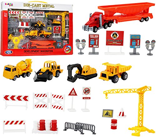 Hours of fun with this great construction play set. The set includes a city street cardboard mat to be played on. All the construction vehicles are functional. The cement tank rotates. Dump truck and bulldozer can be lifted up and down. The excavator can be rotate and the fork is fully functional. The set...