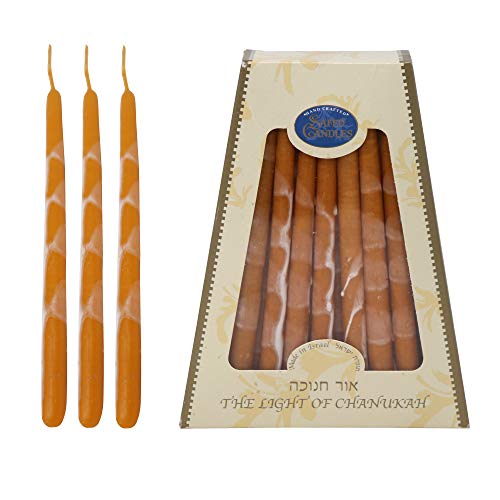 These dripless, beautiful candles have beautiful complexity of red, orange, yellow, and white; with an overlay design giving them a partially marbled appearance. 45 hand dipped candles with hand applied accents. Each one is hand dipped in the holy city of Safed. These gorgeous candles will be a beautiful treat to your Hanukkah menorah....