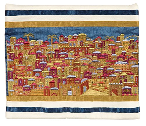 Artist: Yair Emanuel Made in Israel. This unique tallis bag is made of microsuede. In full embroidery there is a scene of Jerusalem in many different shades of blue. Product Features Material: Embroidered Available Colors: Blue, Multicolor, Gold Size: 14″ x 12″ This unique tallis bag is made of microsuede. In full embroidery there...