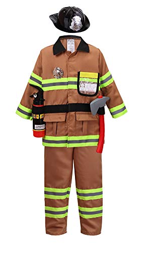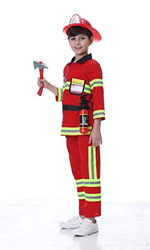 Product Features Dress up and Play set contains everything your little one needs to feel like a real firefighter Includes Jacket, Pants, Helmet, Badge, Fire extinguisherk, Axe and Name tag(7pcs) High-quality materials ensure durability and safety 4 size suitable for age 3 to10 boys and girls pretend play Machine washable jacket and pants; accessories...