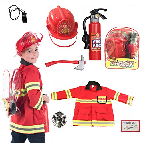 Premium Quality Fireman Role Play and Costume Dress-Up Set (8 pcs) With Backpack and Fire Extinguisher Product Features Fire Chief 8 Piece Pretend Play Dress-Up set For Imaginative Play Includes ADJUSTABLE HELMET with visor, MESS FREE working WATER EXTINGUISHER, axe ,whistle,, name tag ,and fireman knapsack Premium High-quality DURABLE and built to last. KNAPSACK...