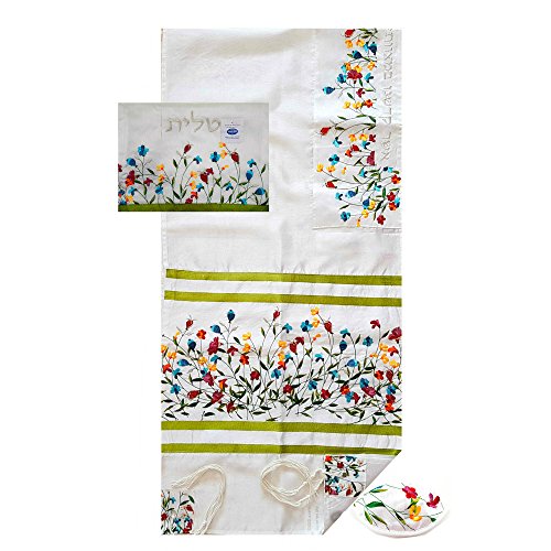 Embroidered Raw Silk Tallit Prayer Shawl Set with Matching Tallit Bag & Kippah Kosher Tzitzit Made in Israel 78″ x 20″. Colorful embroidery Flowers of Paradise and Hebrew blessing on the Atarah (Collar) that reads “Who sancifies us with His commandments and commanded us regarding the commandment of the tzitzit”. Set includes: Tallit, matching...