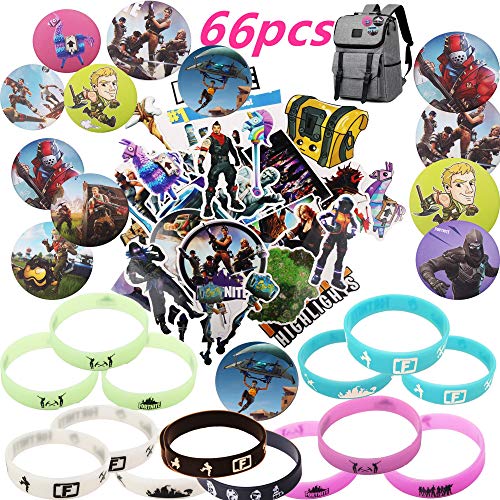 Fort nite Party Supplies 64pcs with Fort nite Bracelets Kids Birthday Party Favors – GLOW IN THE DARK (14 pack) Badge Pins 12 pcs Stickers Variety Waterproof Car Bicycle Luggage Computer Stickers Kids Adults – Set of 40 Product Features video game party favors Fort nite Glow In The Dark bracelets 14 pcs with...
