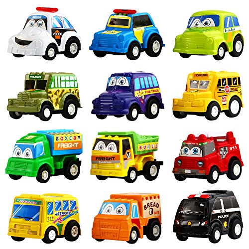 Car toy,measure approx 2.2 inch,12 piece with delicious gift packaging,including police car, taxi, fire truck, bread truck, gas truck,freight truck,fruit car and etc.Pull back vehicles,Easy to play, just pullback the cartoon car and release watch the car run across the room , increase fun when playing,suitable for kids to learn more about car and...