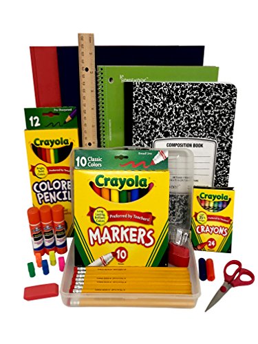 Product Features 2 Folders, 4 Spiral Notebooks, One Hard Pencil Box, One Child’s Scissors 8 No. 2 Pencils, One Pink Eraser, 1 Elmer’s School Glue 4 oz, 2 Elmer’s Glue Sticks 24 Pack Crayola Crayons, 10 Pack Crayola Broad Markers, 1 Wooden Ruler