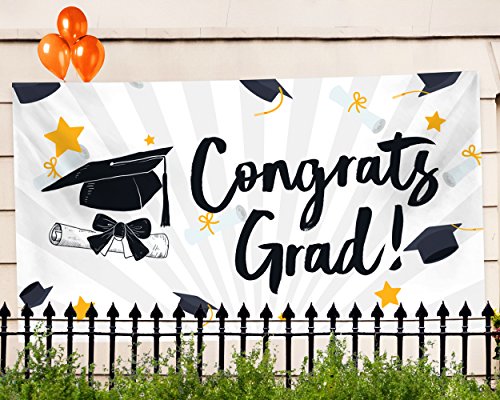 Make Your Graduate Feel Special for Their Significant Achievement! 40″ x 71″ Extra-large graduation banner prop makes a great party centrepiece. Decoration to create a fun atmosphere for your friends and family, to celebrate a great achievement. Large Congrats Grad message to highlight the centre of attention. With cap, hat, tassels and scroll design....