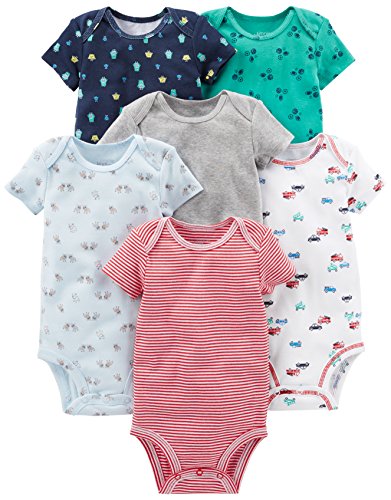 A variety of patterns promotes fresh style with every outfit change in this bodysuit six-pack featuring expandable shoulders that shimmy down for easy getaways during difficult changes. Product Features Six short-sleeve bodysuits in baby-soft cotton featuring stripes, prints, and solids Expandable shoulders Nickel-free snaps on reinforced panels Trusted Carter’s quality, everyday low prices, and...