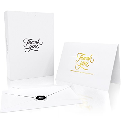 20 Thank You cards with Gold Embossed Letters Each set includes: 20 Thank You Cards 20 Envelopes 20 Stickers Product Features GOLD FOIL EMBOSSED LETTERS WRITING. The elegant letterpress “Thank You” on the front that leave a lasting impression makes them perfect for every special occasion. When the recipient slides the beautiful card from...