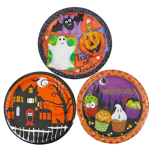 9 inch round paper plates great for your Halloween dinner or party. 10 cup cake monster pattern, 20 haunted house pattern, and 60 fun pattern plates. 90 total plates. Product Features Fun, Spooky Designs Great For Parties, Dinners, Ocktoberfest, and More 3 Unique Patterns Includes 90 Plates Each Plate Measures 9 Inches Across