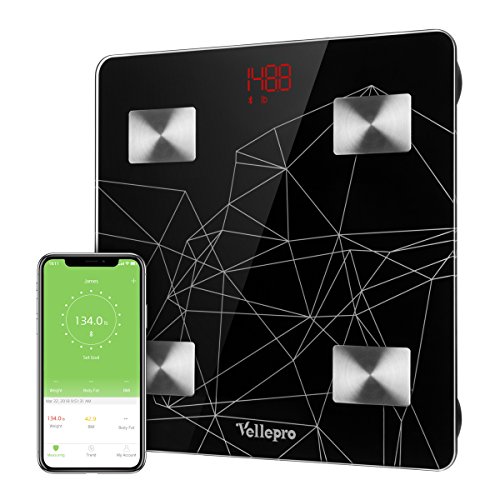 Vellepro Body Fat Scale quickly and easily measures Body Weight,Body Water,Body Fat,BMI (Body Mass Index),BMR (Basal Metabolic Rate in Kcal),Muscle Mass,and Bone Mass.This body scale is perfect for people looking to take control of their health. Correct measurement method 1.For body weight: Place the scale on an even surface and wait at least 10...
