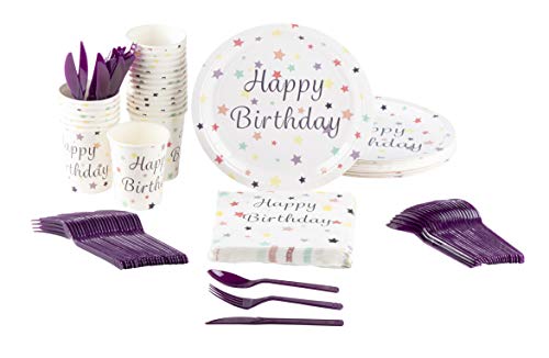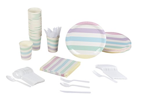 This Juvale Disposable Dinnerware Party Pack has all the dinnerware you need for 24 guests. Includes 24 of each of the following items: Plastic Knives, Spoons, Forks and Paper Plates, Napkins and Cups. Plates are thick and rigid and won’t fold while carrying food. Napkins are soft and absorbent–a pleasure to use. Flatware set...