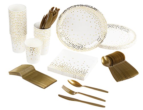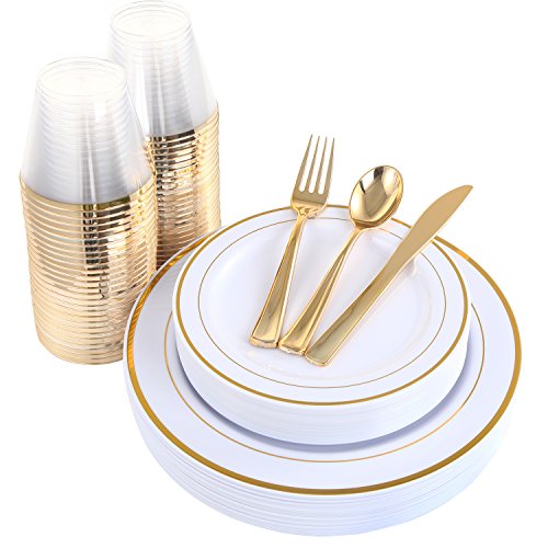 RECYCLABLE & BPA FREE :Enjoy a healthy life with those plastic place setting! Have a healthy and safety celebrate time! GREAT VALUE COMBO: A nice choice for family meals and casual gatherings, the 150 piece collection serve for 25 prople includes: 25 gold plastic dinner plates 10.25″ 25 gold plastic Salad/Dessert plates 7.5″ 25...