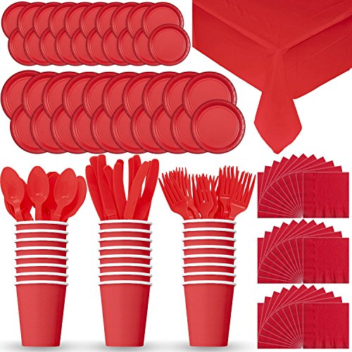 the following items are included in this party pack 40 large 9″ inch paper plates 24 small 7″ inch paper plates 40 lunch (large) napkins 24 large 9 OZ paper cups 24 plastic spoons 24 plastic forks 24 plastic knives 2 108″ inch plastic tablecloths Product Features Everything you need for a party. Just...
