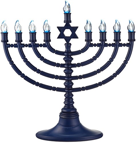 Traditional-style menorah has 9 clear bulbs and a blue finish for an elegant look Electronic sequential lighting,br>Automatic shut-off after 6 hours,br>UL listed for indoor use only,br>Requires 4 “AAA” batteries – not included Dimensions: 11″H x 11″W x 3.25″D Material(s): plastic Product Features Plastic light-weight with flame shape bulbs Comes folded, snap top to base....