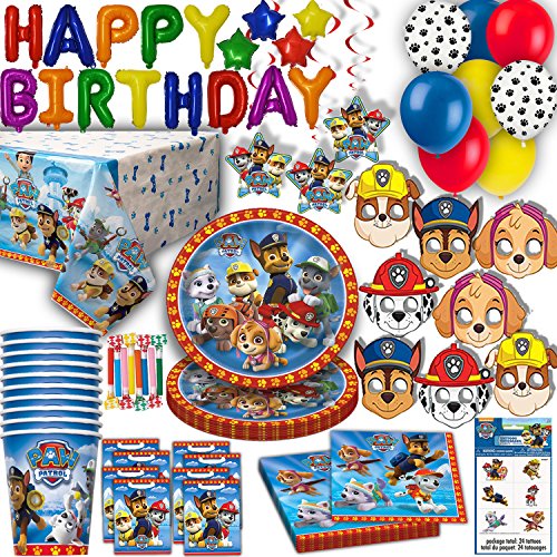 Everything you need for the perfect Paw Patrol Birthday party 16 Plates 16 Cups 16 Napkins 8 Balloons 16 Paw Patrol character masks 16 Loot Bags 3 Hanging decorations 24 Paw Patrol tattoos 1 Paw Patrol plastic tablecloth 16 Party blowout whistles17 Piece balloon banner that includes 13 letters of “HAPPY BIRTHDAY” that are...