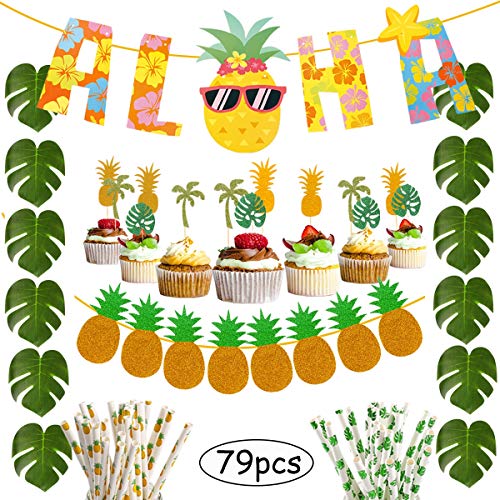 R.HORSE Tropical Hawaiian Jungle Party Decoration Set 3 x Tissue Paper Pineapple 24 x Tropical Palm Leaf 24 x Paper Cocktail Umbrella 24 x Cupcake Toppers 25 x Silk Hibiscus Flowers 1 x Transparent Glue Palm Leaf and Hibiscus Flower are made of lightweight polyester material which is durable and reusable. Pineapple...