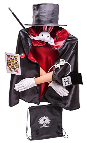 TA-DA! Wave the wand and pull a rabbit out of your hat! Dress up and perform your very first magician tricks with this deluxe magician costume set. The satin magic hat folds, then pops into action with a secret compartment to make just about anything disappear. Reversible satin cape with ruby red lining, basic...