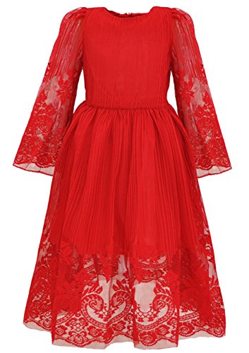 Size Information:———————————————————————————–Size | Bust | Waist | Sleeve Length| Dress Length———————————————————————————–3-4Y | 23.6″/ 60cm | 22.4″/ 57cm | 14.6″/ 37cm | 28.7″/ 73cm———————————————————————————–4-5Y | 24.8″/ 63cm | 23.6″/ 60cm | 15.7″/ 40cm | 30.7″/ 78cm———————————————————————————–5-6Y | 26.0″/ 66cm | 24.8″/ 63cm | 16.9″/ 43cm | 32.7″/ 83cm————————————————————————————7-8Y | 27.2″/ 69cm | 26.0″/ 66cm | 18.1″/ 46cm | 34.6″/ 88m————————————————————————————8-9Y | 28.3″/ 72cm | 27.2″/ 69cm | 19.3″/ 49cm | 36.6″/ 93cm———————————————————————————–10-11Y| 29.5″/ 75cm| 28.3″/ 72cm | 20.5″/ 52cm | 38.6″/ 98cm————————————————————————————Please allow 0.5 inch-0.8 inch difference due to manualmeasurements, your understanding will be appreciated! Product Features Available for 3-11 Years, Please Refer to the Below Detail Description or the Left Picture for Our Size Chart before Ordering Features: Hollow Long Lace Sleeve & Boatneck, Knee-Length Lining, Maxi Length, Concealed Zipper at Back 100% Polyester...