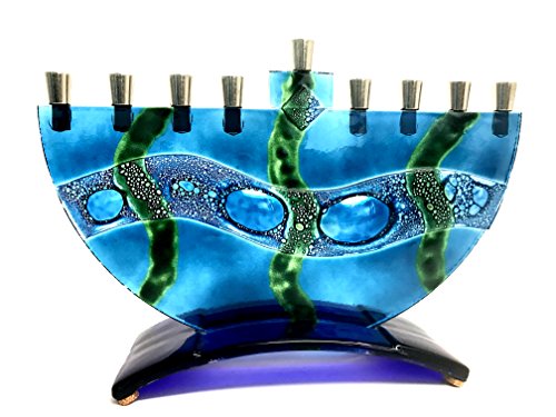 ARTISAN Crafted Fused Glass Menorah – Mediterranean Sea Design Mounted onto Blue Base GUARANTEED to Last for Life or We Will Replace, Exchange or Refund No Questions Asked! DIMENSIONS : 7 inches tall to tip of Shamash (center candlecup) x 10 inches x 4 inches deep Product Features GUARANTEED to Last for Life or...