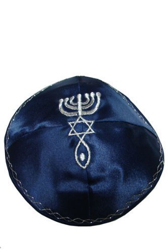 Satin Kippah Yarmulke with Messianic Hebraic Roots symbol embroidered in center and designs around th edges Product Features Satin Kippah Yarmulke with Messianic Hebraic Roots symbol embroidered in center and designs around th edges Kippah to match our Blue with Golden stripes and knitting Tallit or prayer shawl Perfect fit and designed for our...