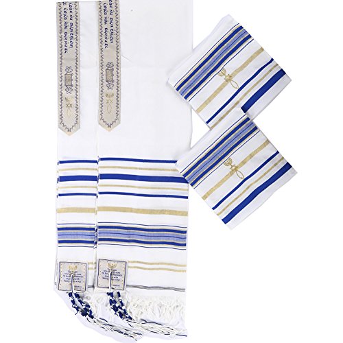 The Messianic Tallit Prayer Shawl is designed with prayer in Hebrew letters and the Four prayers placed on the four corners In English, embroidered with golden thread. It’s made of Polyester, a 72″ long by 24″ wide. The prayer shawl comes in white with blue and golden stripes.