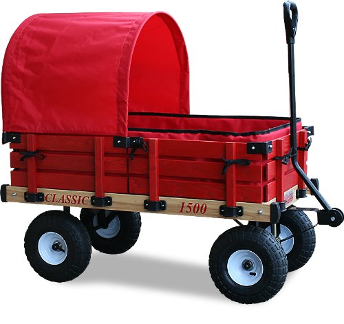 20″ X 38″ Classic Wooden Wagon with 4″ X 10″ Pneumatic Tires, Red Wooden Racks, a Red Half Canopy and a Full Red Floor and Side Pad Set. Product Features Anti-tip Auto Type Steering Extra Length Handle for Effortless Pulling Heavy Duty Undercarriage