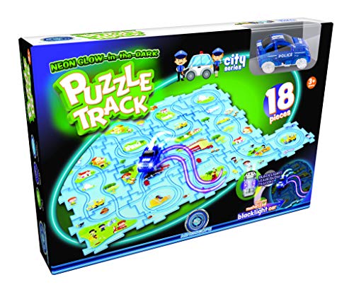 Ready, Set, Glow! with Neon Glow in the Dark Puzzle Track with Black light Police car by Mindscope! Product Features Includes 18 pieces of Neon Glow in the Dark Puzzle track 1 x Police Car that has Black lights underneath that leave glow tracers on the puzzle track! Multiple Puzzle Track configurations! Police Car...