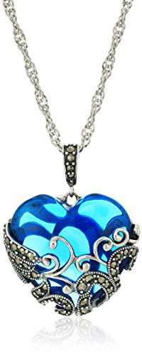 Sterling Silver Oxidized Genuine Marcasite and Swiss Blue Topaz Colored Glass Filigree Heart Pendant Necklace, 18″ Product Features Pendant necklace featuring a Swiss blue topaz tone glass heart encased in oxidized sterling silver with filigree details and genuine marcasite accents A thoughtful jewelry gift that will be cherished for years to come Oxidized sterling...
