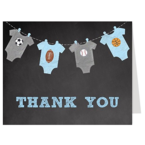 Thank guests for attending your Little All Star themed baby shower or birthday party! Cards feature blue and gray onesies showcasing football, basketball, soccer, and baseball. Includes white envelopes. Product Features ♥ Price includes 50 thank you cards and 50 white envelopes. ♥Thank You Cards are full color front printed, insides are blank white,...