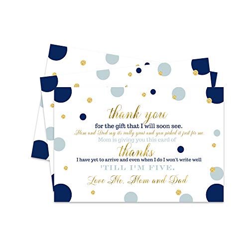 Send a sweet message and a big thank you with this navy and gold dot themed stationery set for baby shower celebrations. Surprise and delight family + friends with these cute baby shower thank you postcards. Our flat thank you cards are perfectly sized, including a message from baby on the front and room...