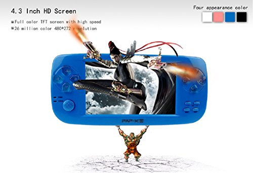 PAP-KIII Game Console Specification:Color:Blue Screen: 4.3 inch screen Resolution:480×272Built-in: It pre-installed 3000 classic games on consoleGame format : Support NEOGEO / CPS / GBA / GBC / GB / SFC / SEGA / GG / SMS / NES TF Card: Max expand to 32G, please make sure the file format is FAT32 Camera :...