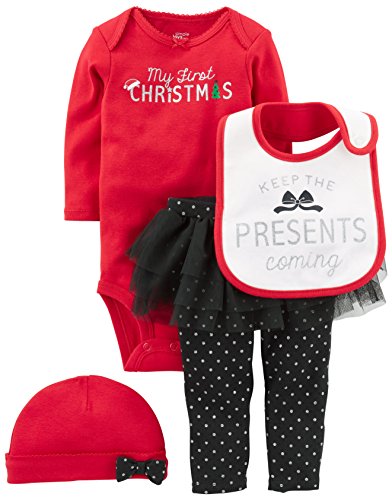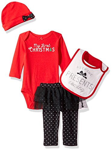 Celebrate baby’s first Christmas in this coordinating four-piece set featuring a long-sleeve bodysuit, polka dot tutu pants, a knit hat, and a festive bib. Product Features Coordinating “My 1st Christmas” four-piece set featuring, long-sleeve bodysuit, tutu-pant, hat, and bib. Black and silver glitter dot pants with black tutu Red bow hat and glitter bib...