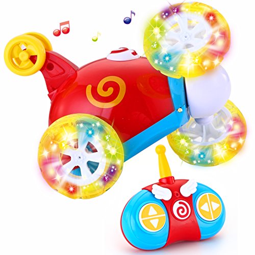 SUPER FUN This is a perfect toddler rc car toy with lightning fast speed, music and flashing tires. SUPER COOL This stunt rc car have 6 wheels and 4 channels controls. The up 4 wheels rotate 360 degrees freely. The 4 channel controls can be combined to do stunt tricks such as erect forward...